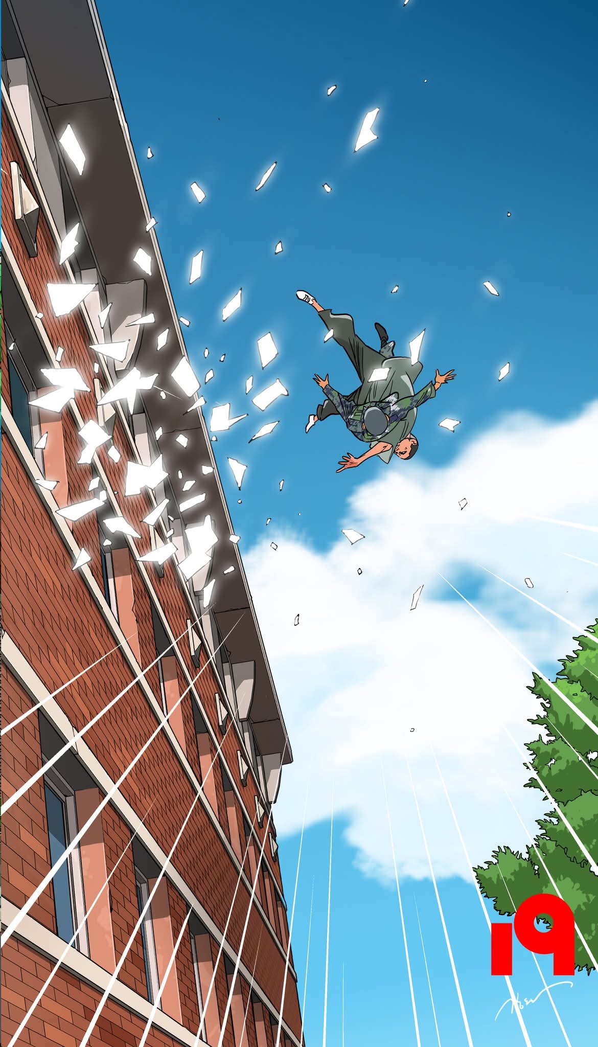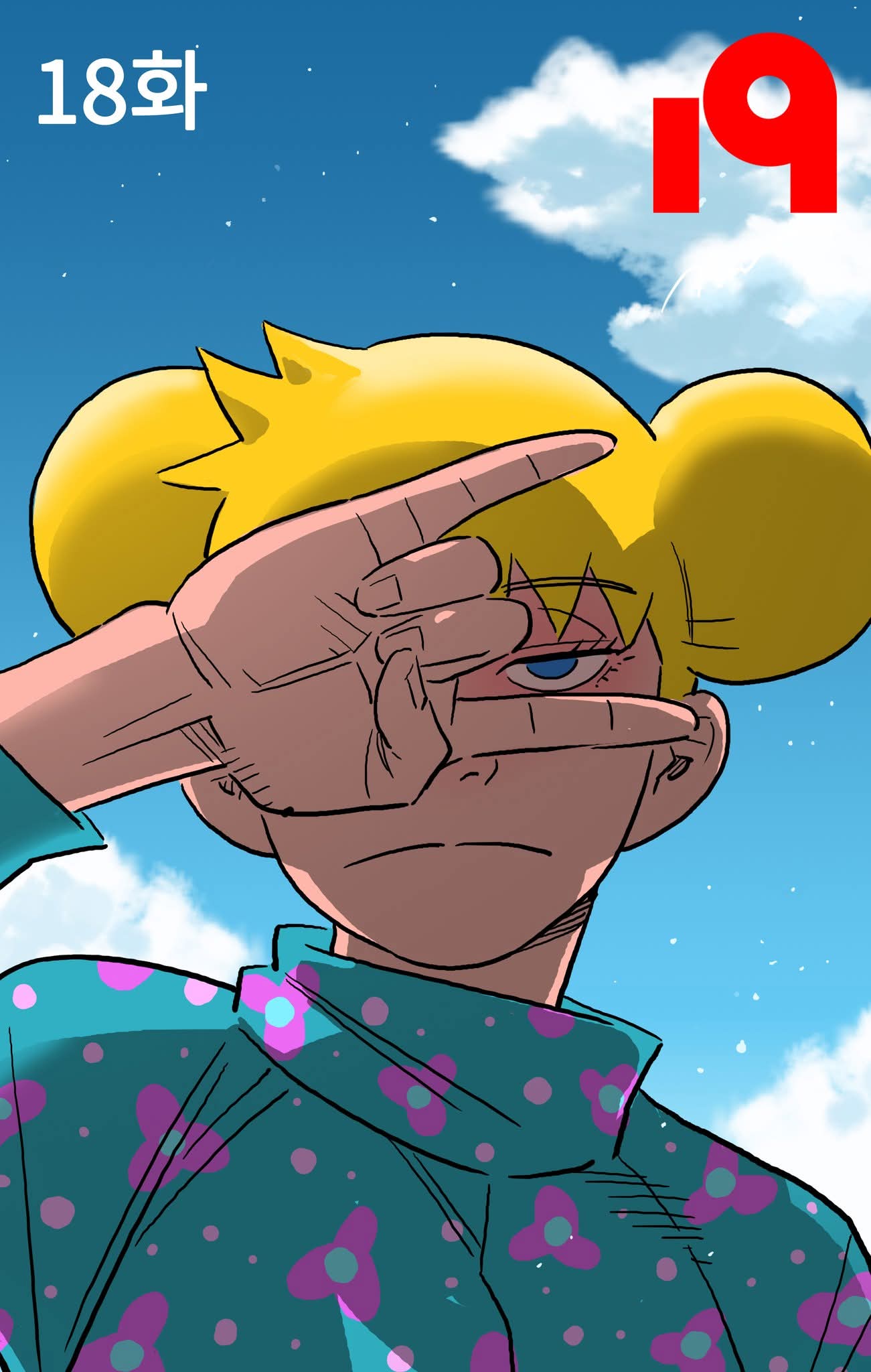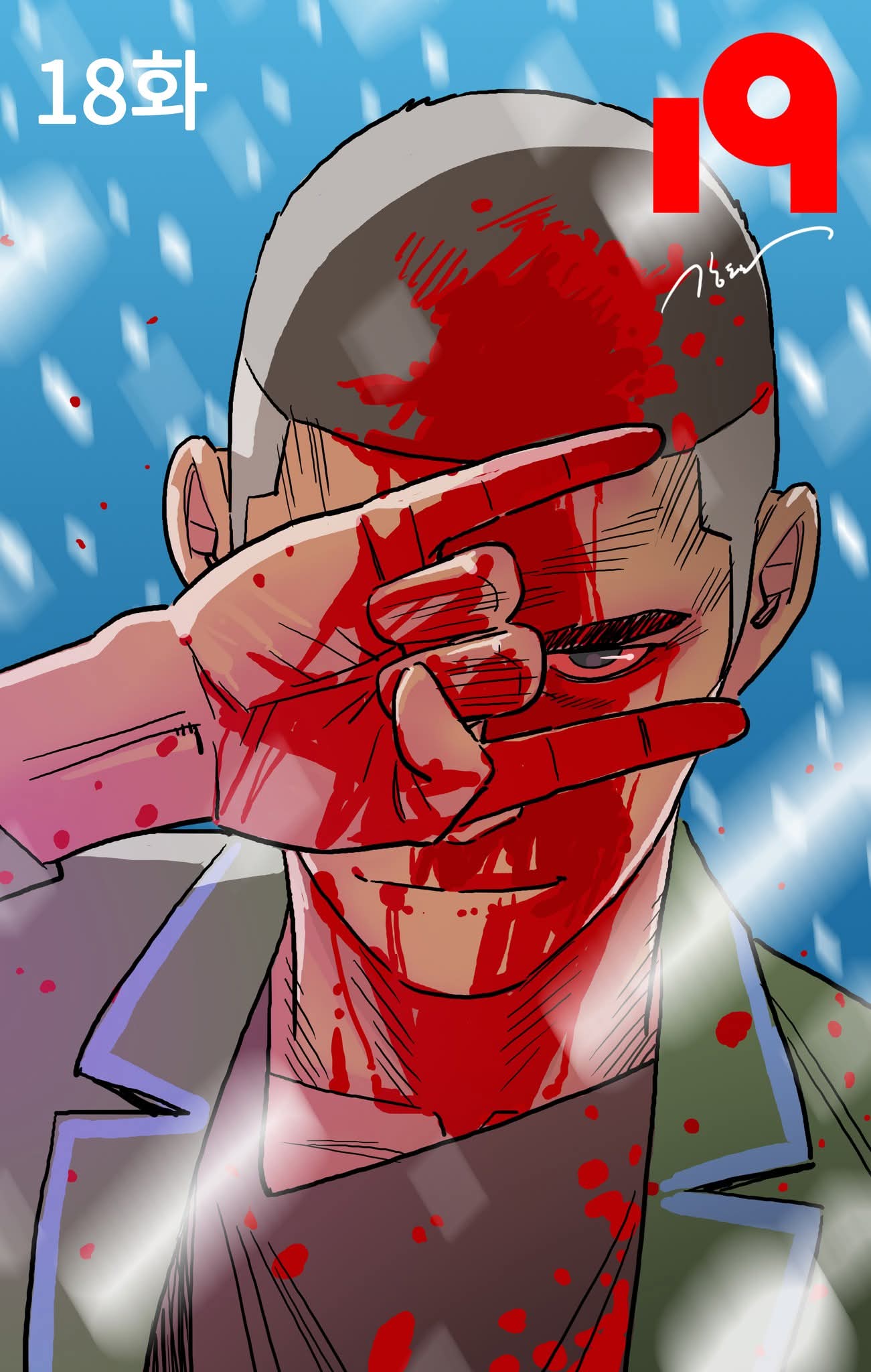 『19』는 한국이 아닌 일본에서 먼저 공개된 뒤, 2025년 한국에서 비독점 동시 연재 방식으로 공개된 강도하의 신작이자 복귀작이다. 장르는 SF와 미스터리, 그리고 사회파 서사의 결합으로 이루어져 있으며, 시즌1은 총 54화로 완결되었다. 작품의 내용은 어느 날 갑자기 지구 전체를 뒤덮은 빛을 마주한 이후 모든 인간의 신체가 ‘19세의 육체’로 변하는 파국적 상황에서 시작된다. 유아, 노인, 장애인을 포함해 모든 연령과 신체적 조건이 한순간에 사라지고, 사람들은 겉모습만 동일한 새로운 세계에 던져진다. 기존 사회 질서는 붕괴하고, 외형적 평등은 역설적으로 더 잔혹하고 원초적인 폭력을 불러오며, ‘치킨블러드’라는 결투 기반의 폭력적 시스템이 등장해 혼돈을 제도화한다.